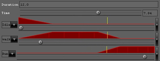 The first picture show a representation of animation tracks: one animation track by line, horizontal axis represents the time and vertical axis the weight (0 off, 1 on, in between for blending/fading). The yellow bar show current time on the track timeline, in this exemple the animation played is a blend between "Walk" and "Run" animations.